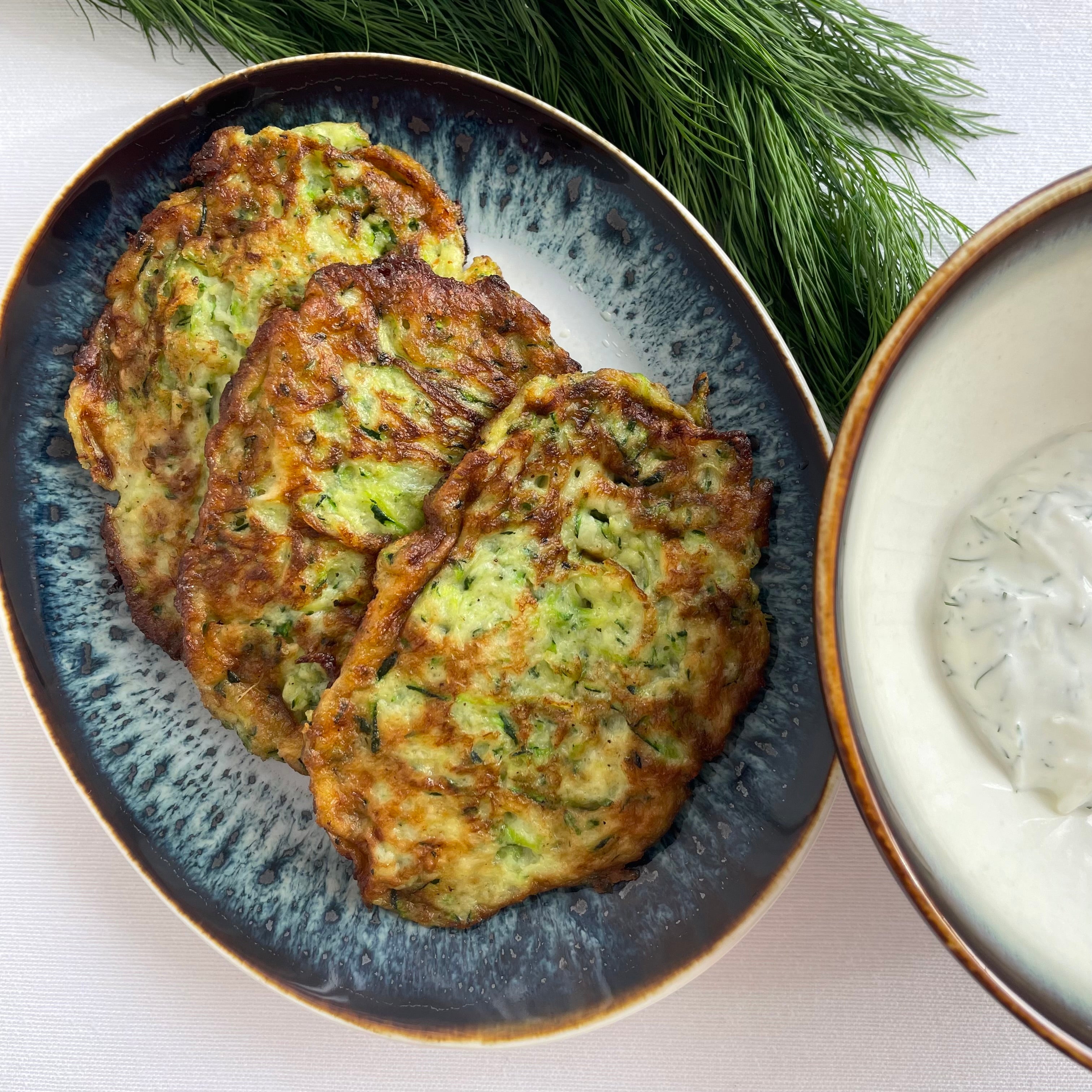 Ingredientes:- 1 calabacín grande- 1 cebolla pequeña- 1 cucharada de harina- 1 huevo- aceite de girasolpara la salsa- 2 cucharadas de yogur griego- 1 diente de ajo- 2 ramas de eneldo fresco Prepara...