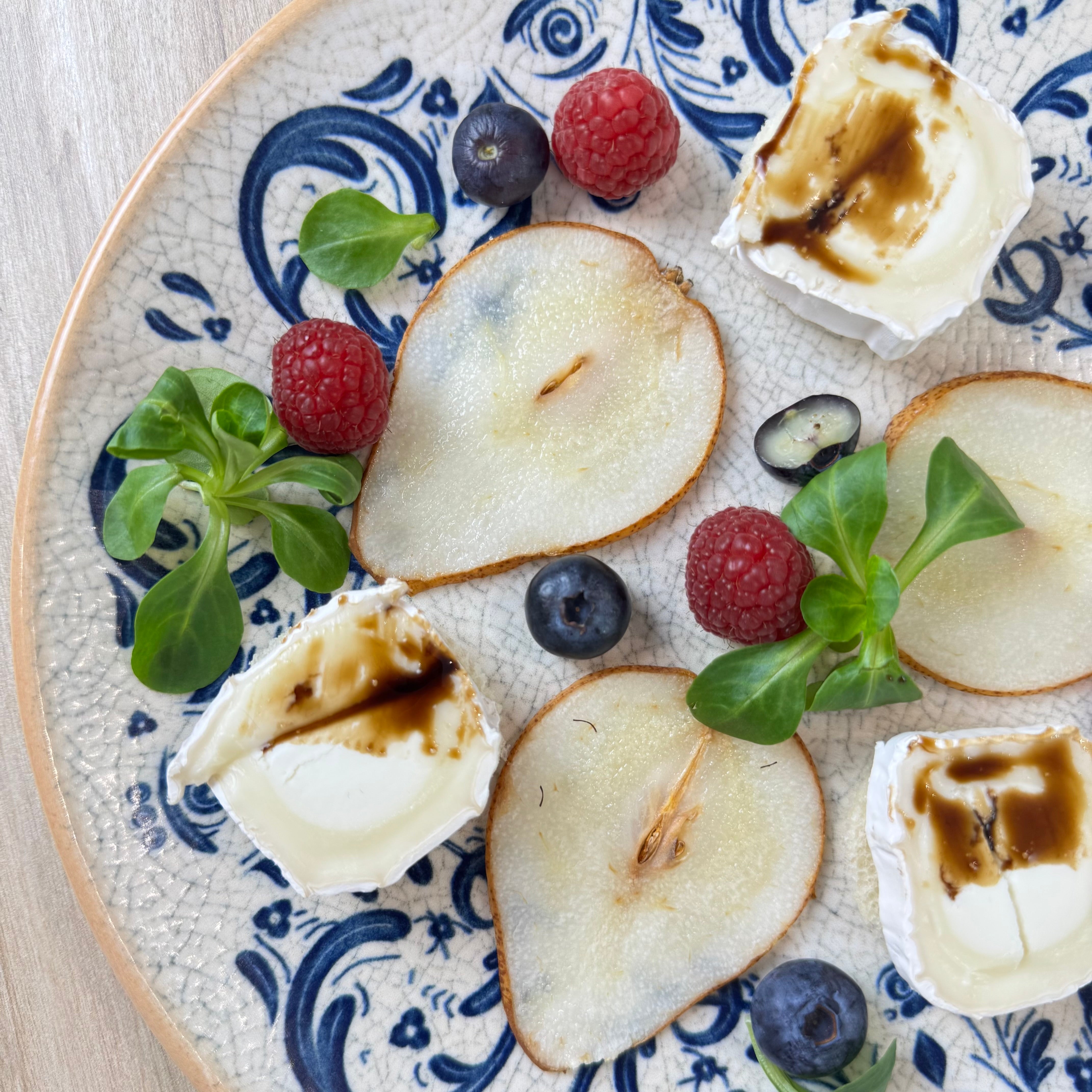 Ingredientes:- 10 rebanadas de pan tostado- 250 g de queso de cabra- 1 pera- 1 cucharada de azúcar- 10 frambuesas- 10 arándanos- 20 g de hojas de lechuga- salsa balsámica Preparación:Tuesta el pan ...